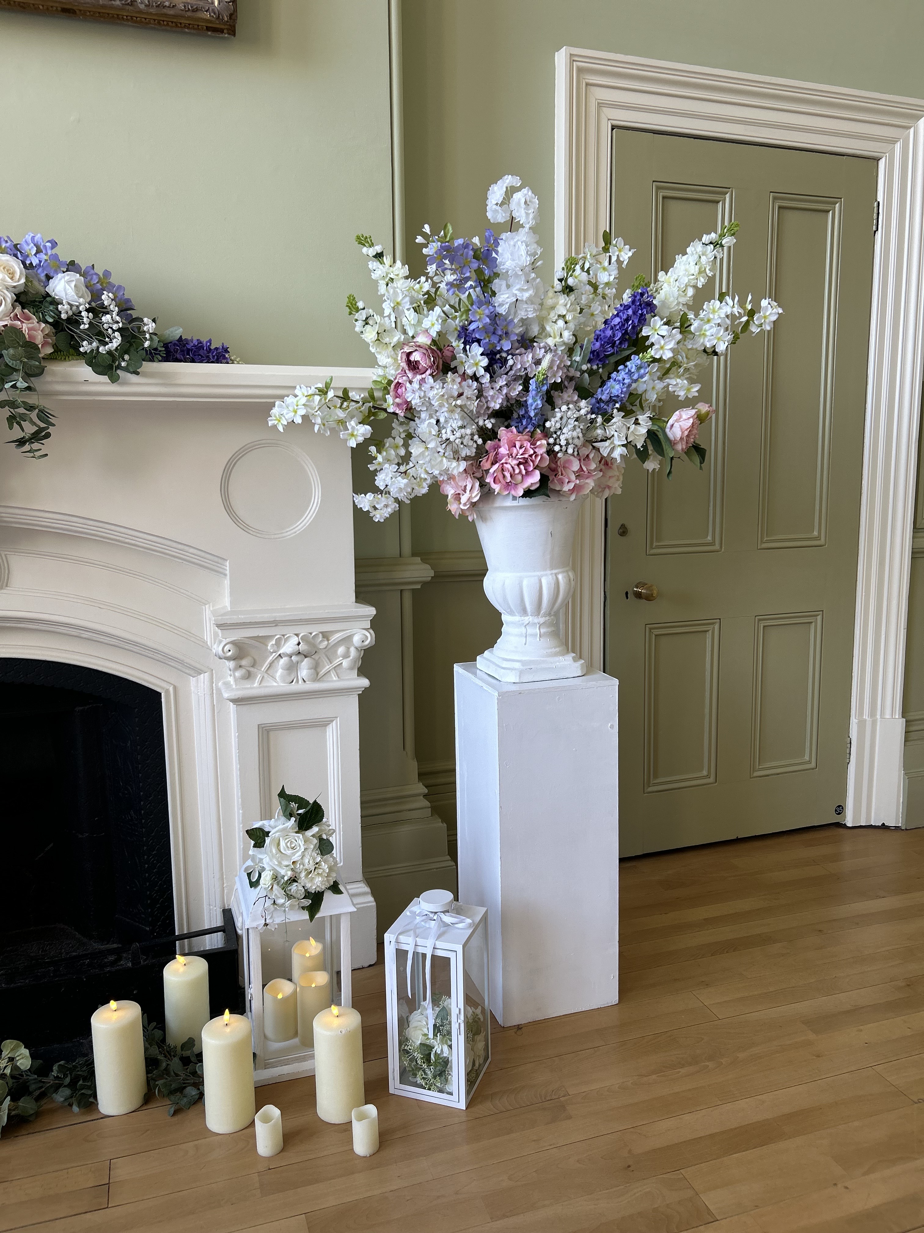Pedestal on Plinth – These striking urn on pillars make a wonderful statement in your ceremony room and can be colour co-ordinated to your wedding They Measure approximately 1.7m high – £150.00 for a pair / £75.00 for a single