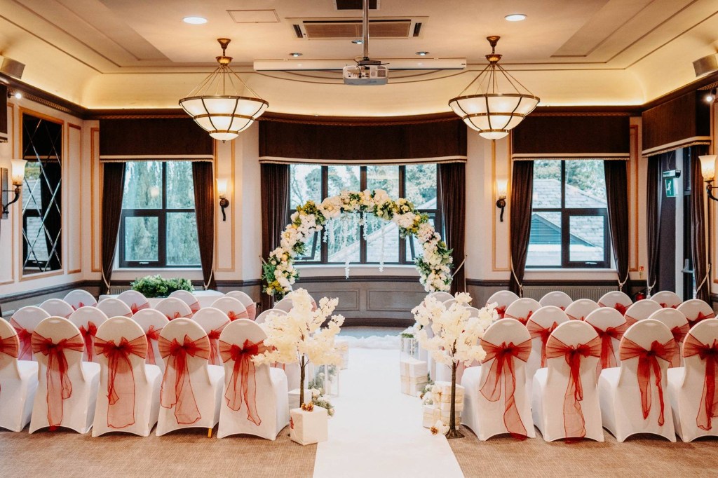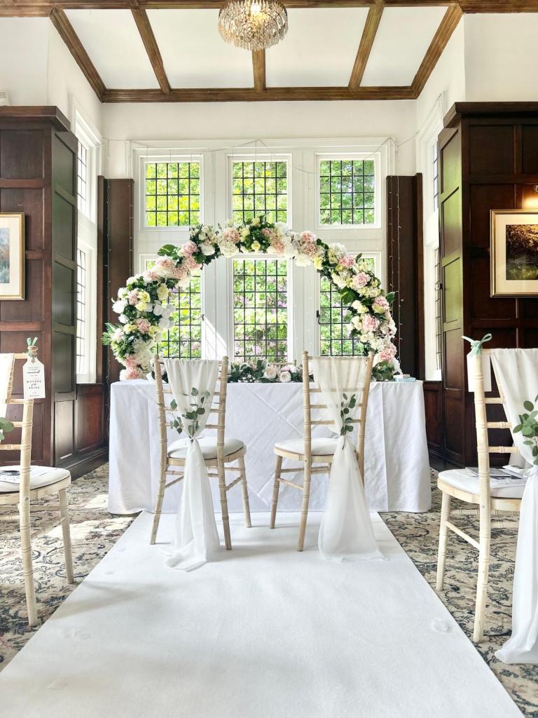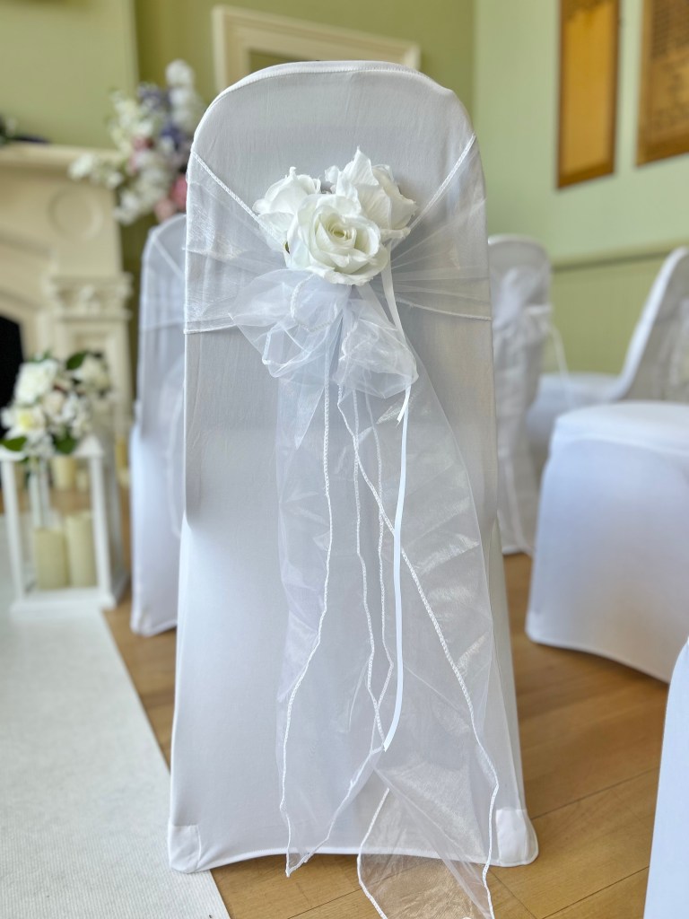 Ivory sash with artificial flower head – £3.00 per chair