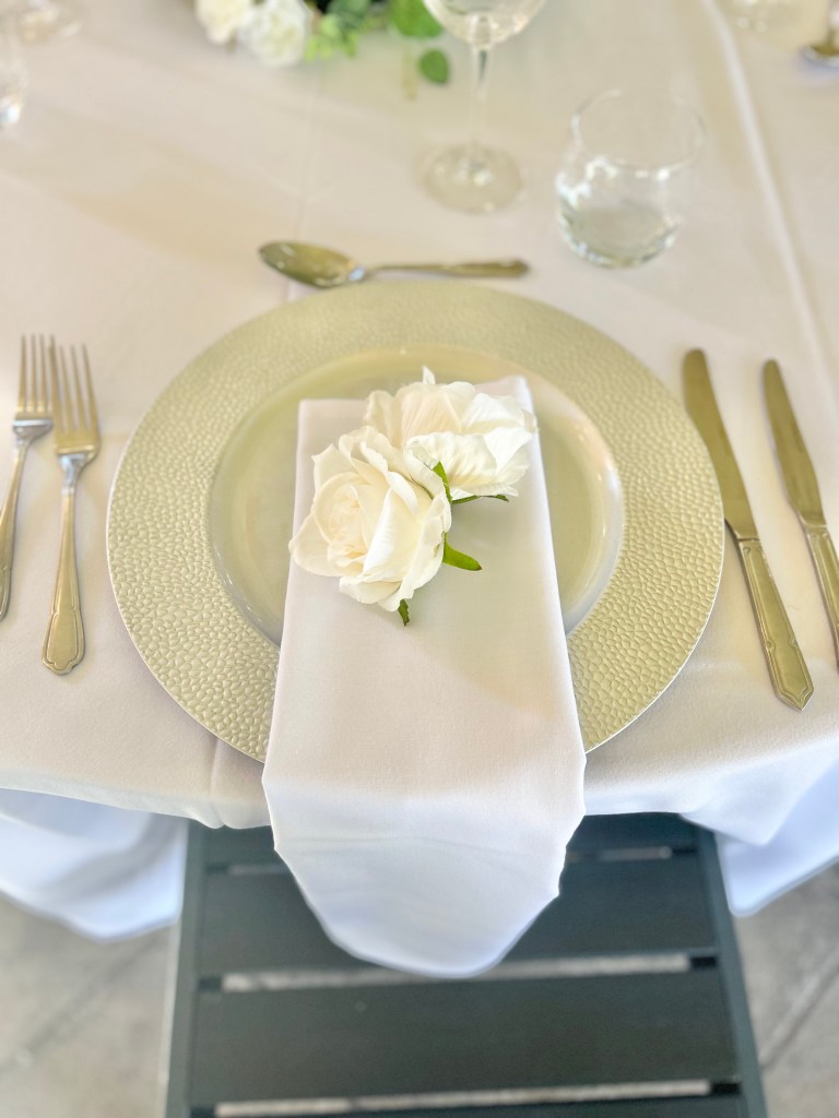 Silver charger plate with two roses – £2.00 per setting